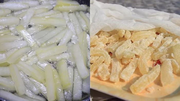 Bước 5: Đun bí trong nước đường cho đến khi nước cạn, sau đó thêm vào một ít vani, rồi phơi bí cho khô.