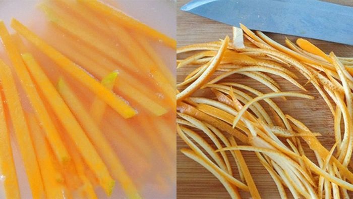 Bước 1: Sơ chế bí đỏ: gọt vỏ, thái sợi, ngâm nước vôi 2 tiếng, rửa sạch. Bên cạnh đó, gọt bỏ lớp vỏ cam và thái thành sợi.
