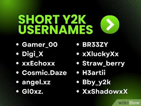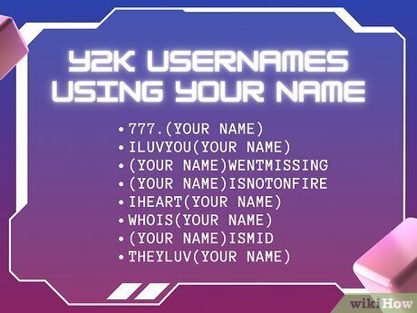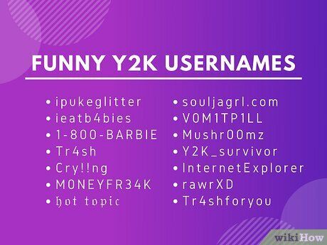 Sử dụng số và ký tự đặc biệt. Vào những năm 2000, mọi người thường dùng số ngẫu nhiên và ký tự đặc biệt để làm cho tên người dùng của họ trở nên độc đáo hơn. Ví dụ, nếu tên “princess” đã được sử dụng, bạn có thể chọn “pr1ncess” hoặc “xxxPrincessxxx.” Việc thay thế các chữ cái ngẫu nhiên trong tên người dùng có thể giúp bạn đạt được phong cách Y2K.