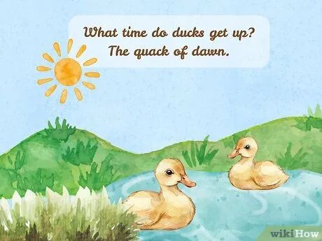 Khiến họ cười nghiêng ngả với một câu chơi chữ hài hước về vịt. Chơi chữ là một loại câu đùa dựa trên các định nghĩa khác nhau của cùng một từ…hoặc những từ nghe rất giống nhau. Mặc dù nhiều người phản ứng với chơi chữ bằng một tiếng rên, nhưng những câu đùa này đã được Shakespeare sử dụng rộng rãi để khiến khán giả cười. Dưới đây là một vài câu chơi chữ thông minh—hoặc ngớ ngẩn—về vịt để bạn thử với bạn bè: