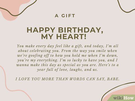 Một Món QuàChúc mừng sinh nhật, trái tim của em! Anh làm mỗi ngày trở thành một món quà, và hôm nay, em chỉ muốn chúc mừng anh. Từ nụ cười của anh khi chúng ta đùa nghịch đến cái ôm của anh khi em buồn, anh là tất cả với em. Em thật may mắn khi có anh, và em muốn ngày hôm nay đặc biệt như anh vậy. Chúc một năm đầy yêu thương, tiếng cười và chúng ta. Em yêu anh nhiều hơn những gì lời nói có thể diễn tả, anh yêu à.
