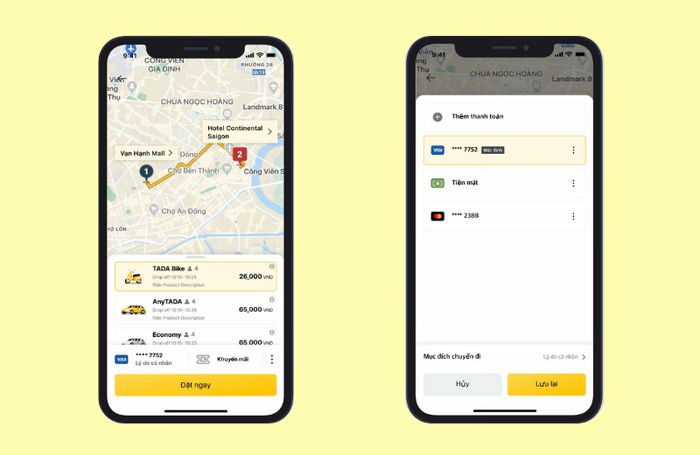 Bước 3: TADA cung cấp nhiều hình thức thanh toán linh hoạt bao gồm tiền mặt, thẻ tín dụng/ghi nợ, hoặc các ví điện tử (tùy vào khu vực) → Hãy lựa chọn phương thức bạn muốn sử dụng trước khi xác nhận đặt chuyến.