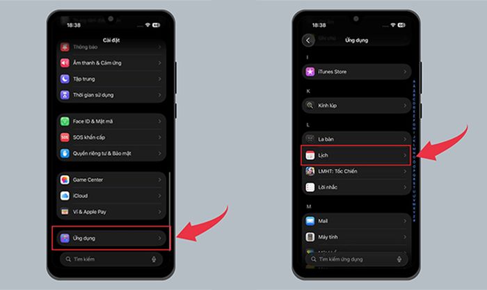 Bước 2: Kéo xuống dưới và tìm mục “Ứng dụng”, sau đó chọn app "Lịch" (Calendar) để truy cập các tùy chọn liên quan.