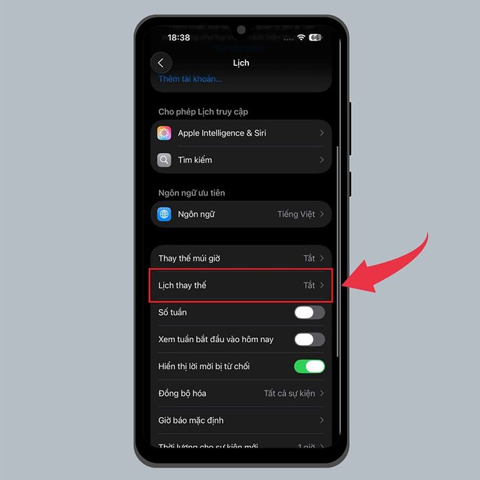 Trong phần cài đặt Lịch, bạn tìm và chọn mục "Lịch thay thế"