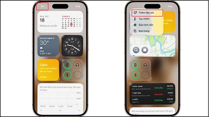 Bạn nhấn vào chữ “Sửa” ở góc trên bên trái màn hình rồi chọn “Thêm tiện ích”