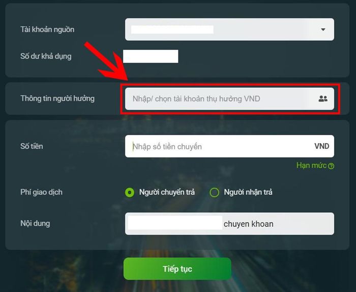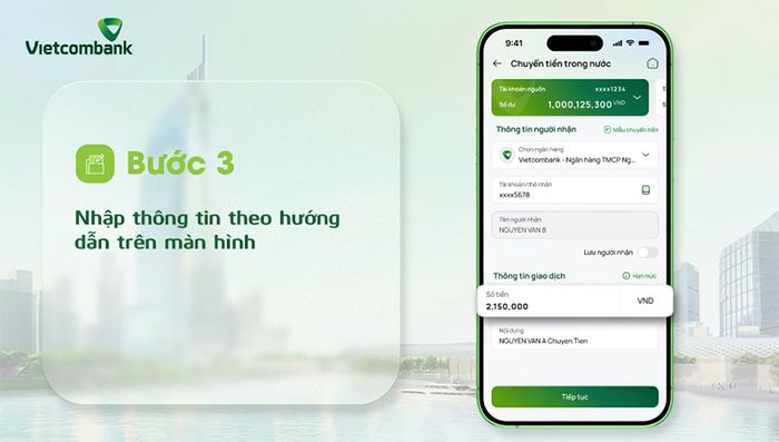 Bước 3: Chọn tài khoản ngân hàng của người nhận, hệ thống sẽ tự động hiển thị tên người nhận khi bạn nhập số tài khoản. Sau đó, điền số tiền chuyển và nội dung giao dịch nếu có, rồi nhấn “Tiếp tục”.