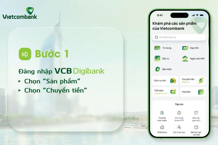 Đăng nhập vào VCB Digibank > Chọn “Sản phẩm” > Chọn “Chuyển tiền”
