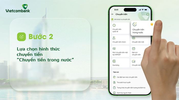 Bước 2: Chọn phương thức chuyển tiền: Bạn có thể lựa chọn các hình thức chuyển tiền như chuyển tiền trong nước, quốc tế, chuyển tiền nhóm, hay thậm chí lên lịch chuyển tiền,... tùy theo nhu cầu.