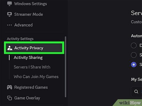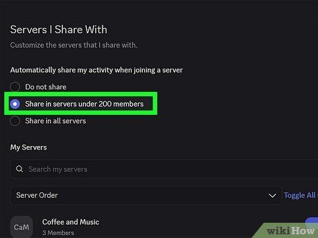Chọn các server bạn muốn chia sẻ trạng thái hoạt động của mình. Dưới phần "Các server tôi chia sẻ với," bạn có thể chọn các server mà bạn muốn tự động chia sẻ trạng thái hoạt động của mình. Bạn có thể chọn "Không chia sẻ," "Chia sẻ trong các server dưới 200 thành viên," và "Chia sẻ trong tất cả các server." Mặc định là "Chia sẻ trong tất cả các server."