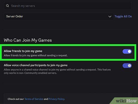 Chọn ai có thể tham gia vào trò chơi của bạn từ trạng thái hoạt động của bạn. Dưới phần "Ai có thể tham gia trò chơi của tôi" (nằm dưới danh sách các server, bạn có thể phải cuộn xuống một chút), bạn có thể chọn ai có thể tham gia trò chơi của bạn mà không cần gửi yêu cầu qua trạng thái hoạt động. Bạn có thể cho phép chỉ bạn bè hoặc bất kỳ người tham gia kênh thoại nào tham gia trò chơi. Nếu cả hai tùy chọn này đều tắt, bất kỳ ai muốn tham gia trò chơi của bạn từ trạng thái hoạt động sẽ cần phải gửi yêu cầu, bạn có thể chấp nhận hoặc từ chối.