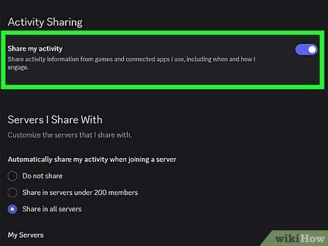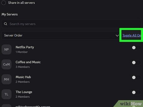 Chọn các server cụ thể mà bạn muốn chia sẻ trạng thái hoạt động của mình. Dưới tiêu đề "Các Server Của Tôi", bạn có thể bật/tắt trạng thái chia sẻ hoạt động cho từng server. Hãy bật hoặc tắt các server tùy theo sở thích của bạn. Bạn cũng có thể nhấp vào "Bật Tất Cả" để ngay lập tức bật trạng thái chia sẻ hoạt động cho tất cả các server.
