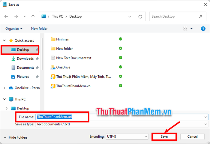 Bước 4: Chọn vị trí lưu shortcut là desktop, đặt tên trong ô File name (lưu ý đặt tên bất kỳ nhưng phải có đuôi .url). Sau đó nhấn Save để lưu.