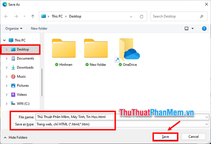 Bước 2: Khi cửa sổ Save As hiện lên, chọn thư mục lưu là Desktop, đặt tên cho file trong ô File name, chọn Trang web trong mục Save as type, chọn chỉ HTML và nhấn Save.