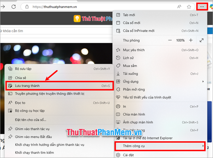 Bước 1: Mở trang web bạn muốn lưu trên trình duyệt, sau đó chọn biểu tượng tùy chỉnh và thiết lập → Thêm công cụ → Lưu trang thành (tuỳ thuộc vào trình duyệt bạn đang sử dụng mà cách chọn lưu trang có thể khác nhau, hoặc bạn có thể nhấn Ctrl + S để mở nhanh tính năng lưu trang trên tất cả các trình duyệt).