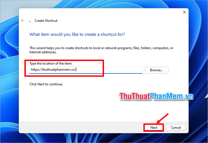 Bước 3: Dán địa chỉ trang web đã sao chép vào ô Type the location of the item, sau đó chọn Next.