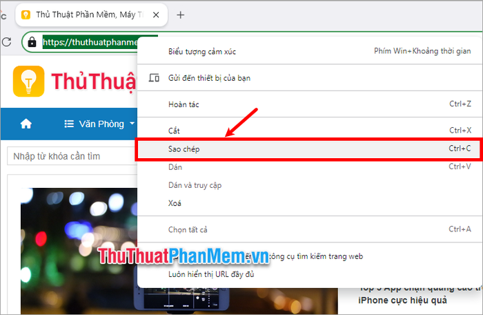 Bước 1: Sao chép địa chỉ trang web bằng cách bôi đen dòng địa chỉ trên trình duyệt, sau đó nhấn chuột phải và chọn Sao chép (hoặc sử dụng tổ hợp phím Ctrl + C).
