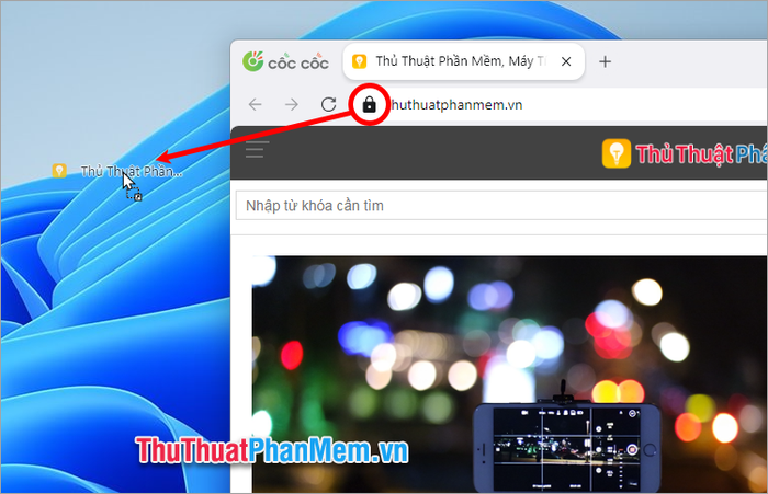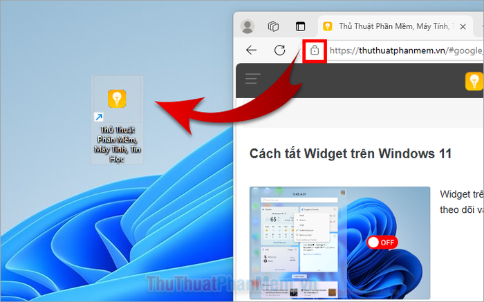 Cách nhanh nhất để đưa trang web ra màn hình desktop trên Windows 11 là kéo thả. Bạn chỉ cần mở trình duyệt và vào trang web muốn tạo shortcut. Sau đó, thu nhỏ trình duyệt và nhấn giữ biểu tượng hình ổ khóa trước địa chỉ trang web rồi kéo thả nó ra ngoài màn hình.