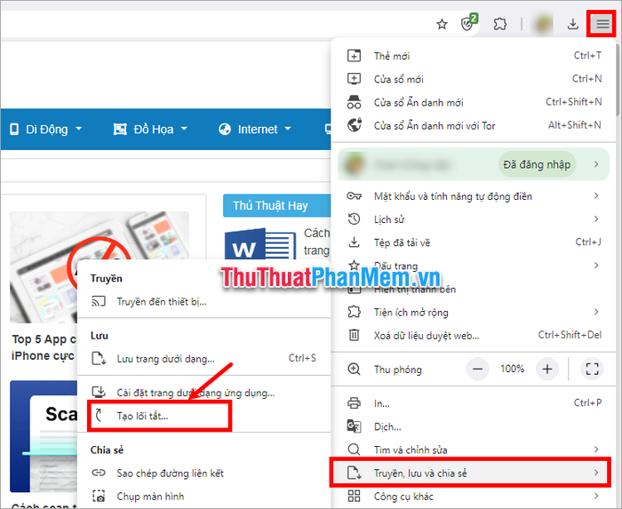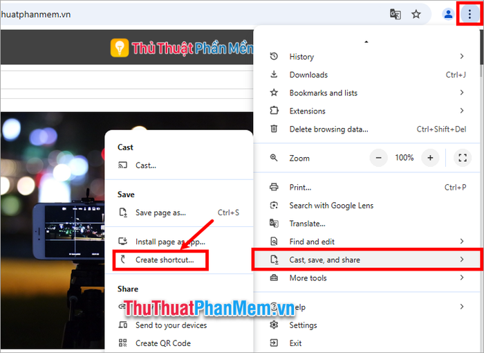 Với Google Chrome, bạn chọn biểu tượng Customize and Control → Cast, Save and Share → Create Shortcut.