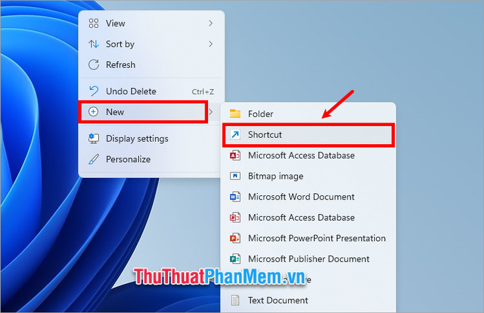 Bước 2: Trên màn hình desktop, bạn click chuột phải và chọn New → Shortcut.