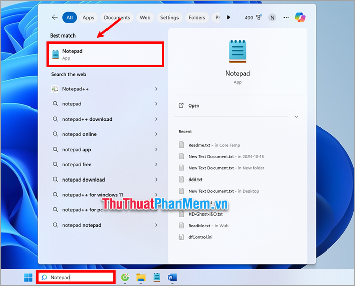 Bước 1: Gõ Notepad vào thanh tìm kiếm và chọn Notepad từ kết quả tìm kiếm.