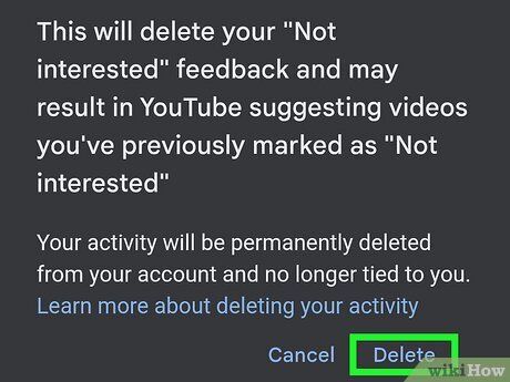 Chọn Xóa. Điều này sẽ xóa tất cả phản hồi "Không Quan Tâm" và "Không Đề Xuất Kênh" mà bạn đã gửi trên YouTube.