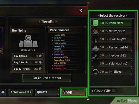 - Để tặng, vào tab Cửa Hàng, sau đó nhấn “Mở UI Quà Tặng.” Chọn tên người bạn muốn tặng Reroll, rồi nhập số lượng Rerolls bạn muốn tặng.