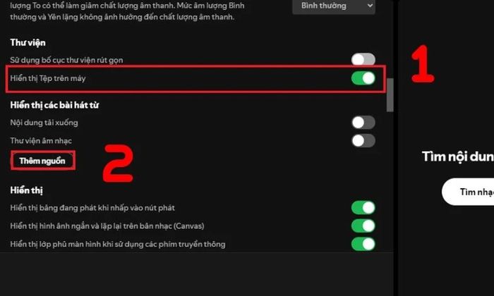 Bước 2: Kéo xuống phần cài đặt và bật tùy chọn Hiển thị Tệp trên máy. Nếu các bài hát chưa hiện ra, bạn chỉ cần nhấn vào Thêm nguồn → Chọn thư mục chứa nhạc trên máy tính của bạn.