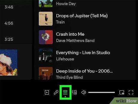 Nhấn vào nút hàng đợi ở góc dưới bên phải cửa sổ Spotify. Nút hàng đợi có biểu tượng hình chữ nhật dạng viên thuốc với hai đường kẻ dưới. Nó nằm bên trái nút điều chỉnh âm lượng, ngay bên trái biểu tượng giống như loa và màn hình máy tính.