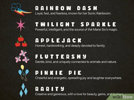 - Rainbow Dash (Mây với tia sét cầu vồng): Tượng trưng cho lòng trung thành, tốc độ, và khả năng Sonic Rainboom của cô, điều này rất quan trọng trong câu chuyện.