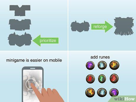 - Cải thiện trang bị của bạn và thêm rune. Bất kỳ trang bị nào bạn rèn sẽ trở nên mạnh mẽ hơn nếu bạn cải thiện nó. Và rune có thể là cách tuyệt vời để thêm một sức mạnh bổ sung cho giáp, như tăng cường phòng thủ (Ward Patch) hoặc chế độ Berserk (Rage Mark).