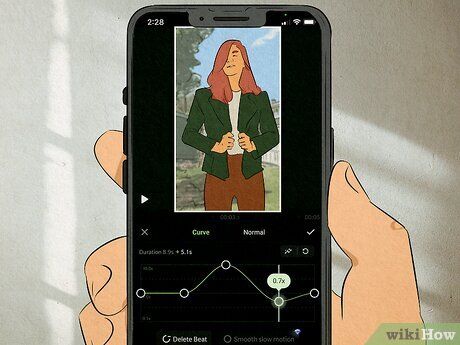 Sử dụng đồ thị đường cong để tăng tốc và làm chậm video. Bạn sẽ thấy một đồ thị với một đường thẳng và các điểm. Mỗi điểm trong đó có thể được kéo. Kéo một điểm lên cao trên đồ thị để làm phần video đó nhanh hơn, hoặc kéo xuống thấp để làm chậm lại. Trộn lẫn tốc độ video sao cho một số đoạn nhanh, một số đoạn chậm, rồi nhấn “Lưu” và tải video lên TikTok như bình thường.