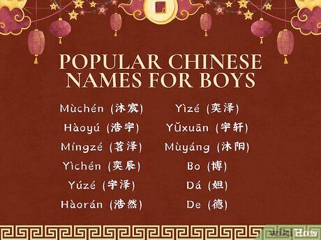 Các tên Trung Quốc phổ biến cho bé trai thường tập trung vào các chủ đề đạo đức hoặc tinh thần. Những cái tên như Yúzé và Yìzé đều mang nghĩa “lòng tốt,” trong khi Mùchén, Hàoyú, và Míngzé lại có ý nghĩa về vũ trụ. Fu có nghĩa là “may mắn,” trong khi Míngzé mang ý nghĩa rất cụ thể là “lòng tốt của lá trà.” Dưới đây là một số tên khác thường được đặt cho bé trai ở Trung Quốc: