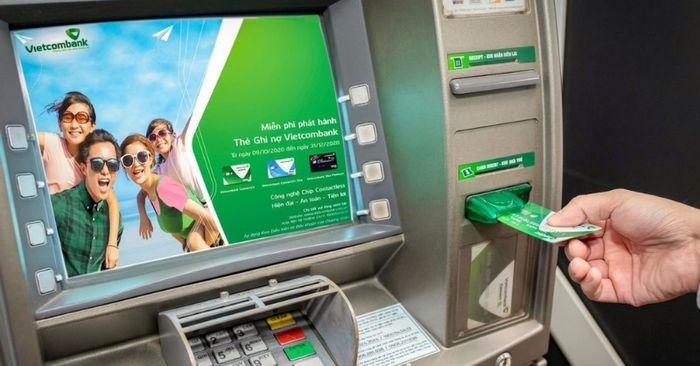 Bước 1: Đến cây ATM Vietcombank gần bạn, cho thẻ vào khe nhận thẻ như khi thực hiện giao dịch rút tiền.