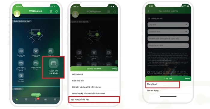 Bước 2: Tại màn hình chính, cuộn xuống và chọn Quản lý dịch vụ thẻ → Chọn Dịch vụ thẻ khác → Nhấn vào Tạo mới/Đổi mã PIN.