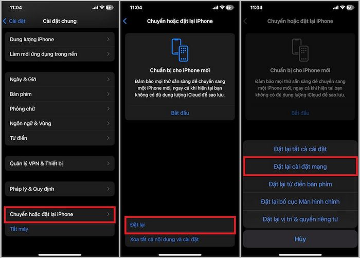 Nếu điểm truy cập cá nhân iPhone cứ liên tục tự tắt dù bạn đã thử nhiều cách, rất có thể cấu hình mạng của iPhone đã bị xung đột. Để khắc phục, bạn có thể Đặt lại cài đặt mạng bằng cách: Cài đặt → Cài đặt chung → Chuyển hoặc đặt lại iPhone → Đặt lại → Đặt lại cài đặt mạng. Sau khi hoàn tất, iPhone sẽ xóa các cài đặt mạng cũ và làm mới toàn bộ cấu hình mạng.