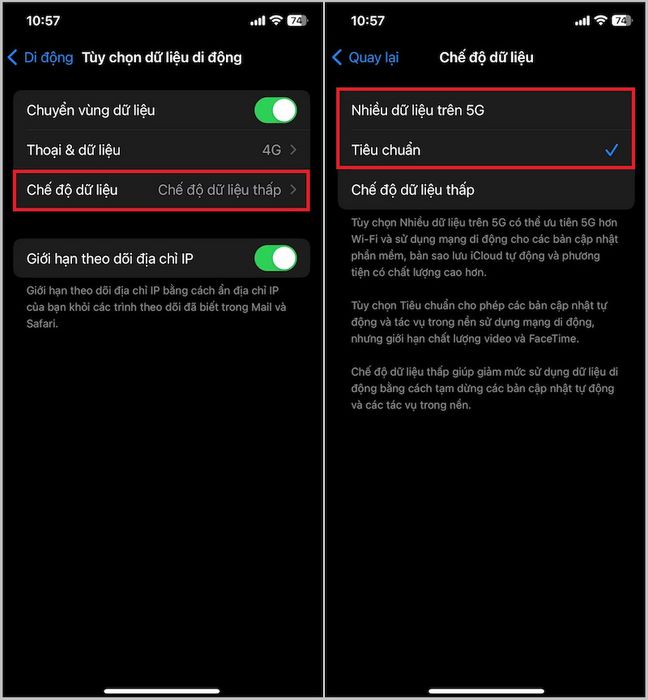 Đôi khi vấn đề không phải do tính năng Hotspot mà là do kết nối mạng 4G/5G của bạn. Nếu bạn bật Chế độ dữ liệu thấp, iPhone sẽ tự động ngắt kết nối khi phát hiện dung lượng tiêu thụ quá nhanh. Để điều chỉnh lại, bạn vào Cài đặt → Di động → Tùy chọn dữ liệu di động → Chế độ dữ liệu → Chọn Tiêu chuẩn/Nhiều dữ liệu trên 5G.