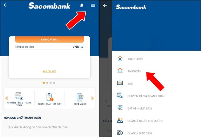 Chọn mục "Tài khoản" từ danh sách menu