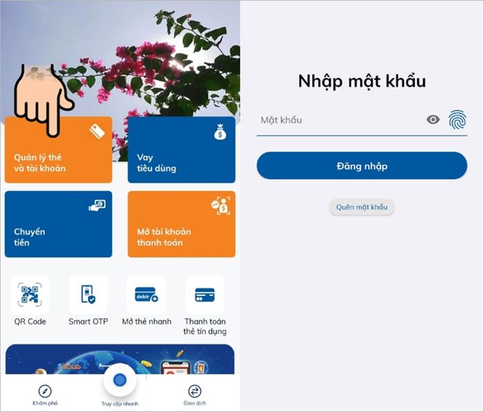 Bước 2: Đăng nhập vào tài khoản Sacombank của bạn bằng mật khẩu hoặc sử dụng xác thực sinh trắc học.