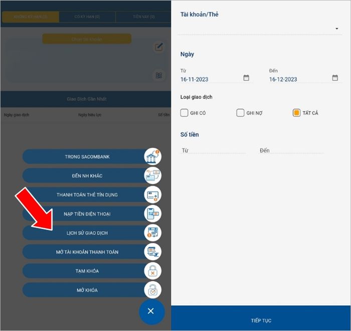 Bước 5: Bạn có thể lọc các giao dịch theo khoảng thời gian (từ ngày đến ngày), loại giao dịch hoặc số tiền để xem chi tiết cụ thể.