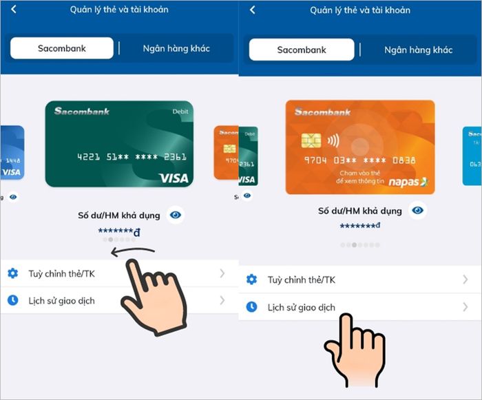 Chọn thẻ hoặc tài khoản cần kiểm tra, sau đó nhấn vào mục "Lịch sử giao dịch"