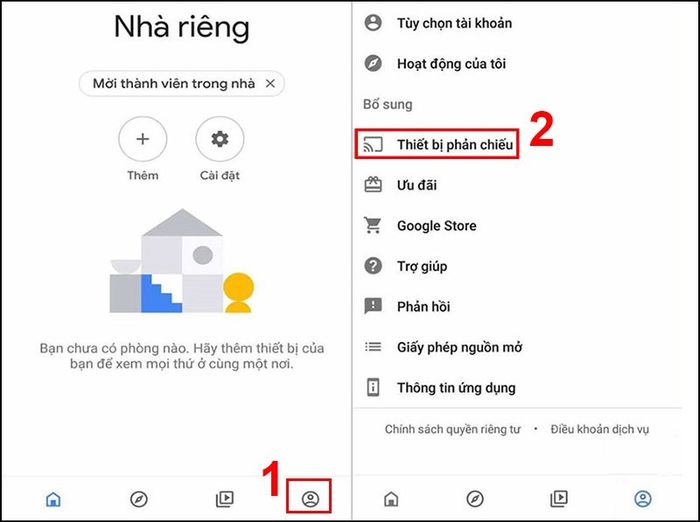 - Bước 2: Mở ứng dụng Google Home > Vào phần “Account” (biểu tượng ngoài cùng ở bên phải phía dưới màn hình) và chọn mục “Thiết bị phản chiếu”.
