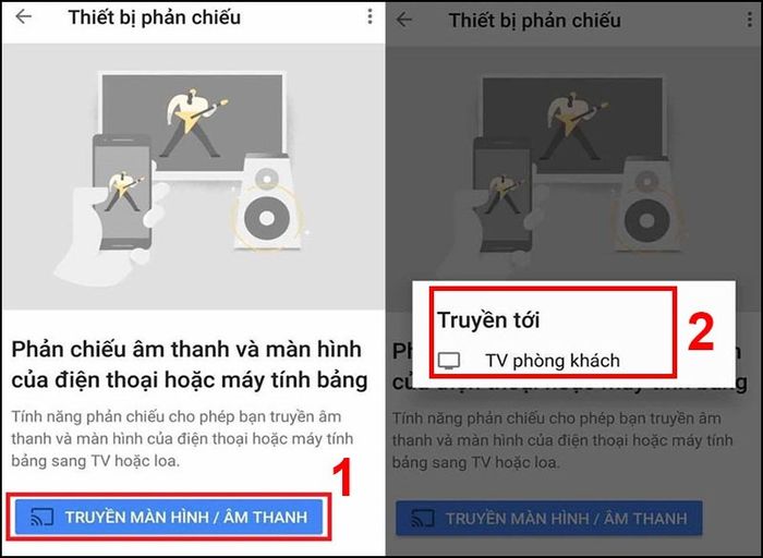 Chọn ô “Truyền màn hình/Âm thanh” và truyền tới TV phòng khách