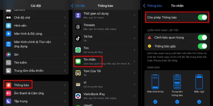 - Bật thông báo Tin nhắn: Đảm bảo rằng thông báo cho ứng dụng Tin nhắn đã được bật. Vào Cài đặt → Thông báo → Tin nhắn, bật "Cho phép thông báo" và chọn kiểu thông báo như băng rôn hoặc biểu ngữ.
