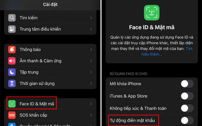 Tắt tính năng tự điền mật khẩu: Để vô hiệu hóa hoàn toàn tính năng tự điền, bạn quay lại mục "Face ID & Mật mã" hoặc "Mật khẩu" và tắt tùy chọn "Tự động điền mật khẩu".