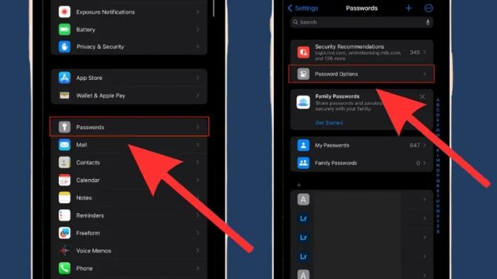 Bước 1: Mở ứng dụng Cài đặt, chọn mục Mật khẩu → Tùy chọn mật khẩu.