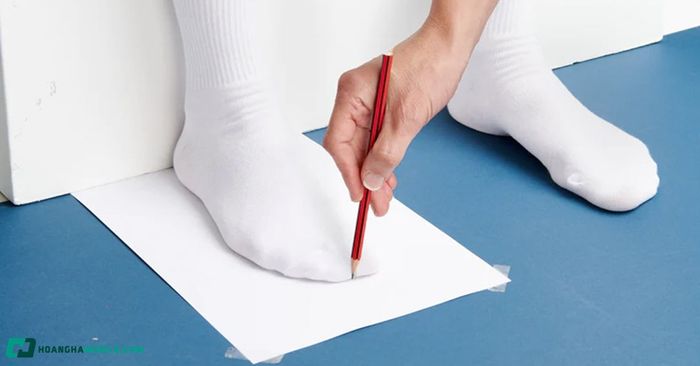 Trải tờ giấy trên bề mặt cứng phẳng như nền nhà. Đặt bàn chân không mang giày lên giấy, áp sát gót vào tường hoặc cạnh thẳng để xác định chính xác kích thước. Giữ chân ở tư thế tự nhiên, không vẹo hay co ngón để hình phác họa không bị biến dạng.