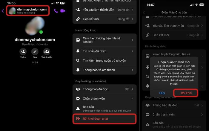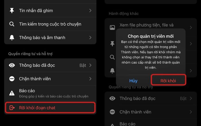 - Bước 3: Sau khi xóa toàn bộ thành viên, bạn có thể rời nhóm bằng cách nhấn ‘Rời khỏi đoạn chat’ và ‘Rời khỏi’, lúc này nhóm sẽ tự động bị xóa.