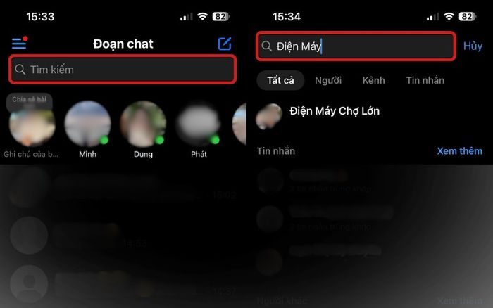 Gõ tên nhóm vào thanh tìm kiếm để nhanh chóng tìm và truy cập nhóm chat.
