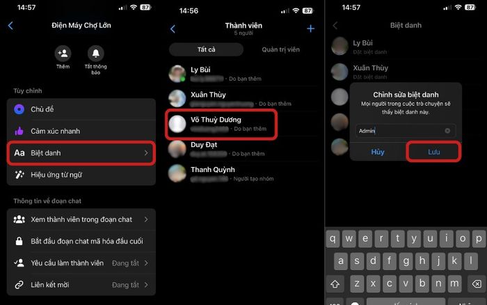 Đặt biệt danh cho thành viên: Nhấn vào tên nhóm ở bên phải màn hình > Chọn mục ‘Biệt danh’ > Chọn tên thành viên cần đặt biệt danh > Nhập biệt danh và nhấn ‘Lưu’ để hoàn tất.