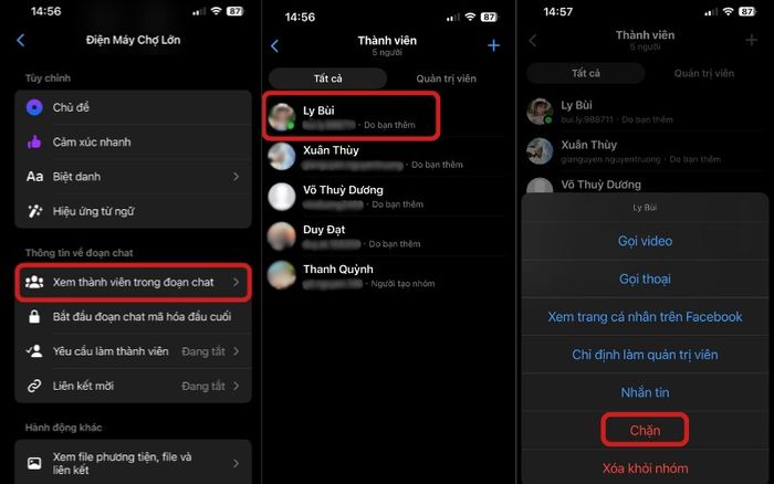 Chặn thành viên: Từ cửa sổ ‘Xem thành viên trong đoạn chat’, tìm thành viên bạn muốn chặn > Nhấn vào tên hoặc biểu tượng của họ > Chọn ‘Chặn’ và xác nhận bằng cách nhấn ‘Xong’.